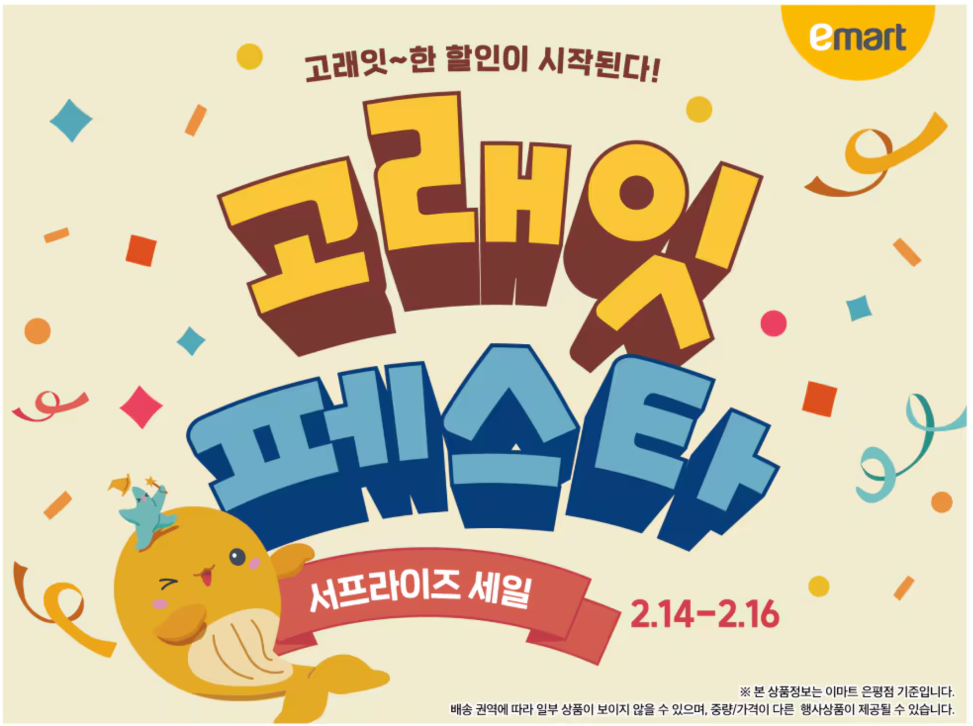 이마트 고래잇 페스타가 2025년 2월 14일 ~ 16일까지 3일동안 진행됩니다. 전국 이마트 매장과 온라인 몰에서 진행되니 지금 바로 확인해 보세요!